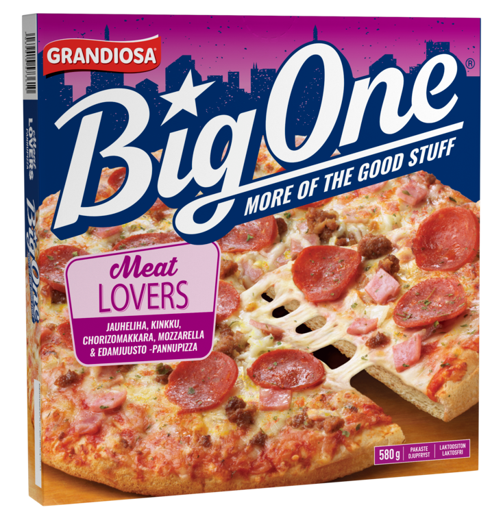 Grandiosa Big One® pakastepizza on amerikkalaistyylinen, mehevä, ruokaisa ja paksupohjainen pannupizza, joka sopii myös laktoosittomaan ruokavalioon. Big One Meat Lovers tarjoilee lihan, juuston ja pikanttien makkaroiden ystäville makunystyröitä kutkuttavan herkun: täyteläisen yhdistelmän mausteista chorizoa, korkealaatuista jauhelihaa, kinkkua sekä suussa sulavaa mozzarellaa ja edamjuustoa. Täytteiden hyvä maku ja mehevyys korostuvat laadukkaan pizzapohjan ansiosta: pohja on sisältä kuohkea ja alta mukavan rapsakka. Saat tämän herkun parhaat puolet esiin laittamalla pizzan jäisenä uuniin ja paistamalla sen 225 asteessa. Poista pakkaus ja lämmitä pizzaa uunipellillä uunin keskiosassa noin 14-17 minuuttia tai kunnes juusto on sulanut ja saanut kullankeltaisen värin. Todella rapean lopputuloksen saat paistamalla pizzan ritilän päällä. Big One pannupizzoissa on enemmän kokoa ja enemmän makua: More of the good stuff! –